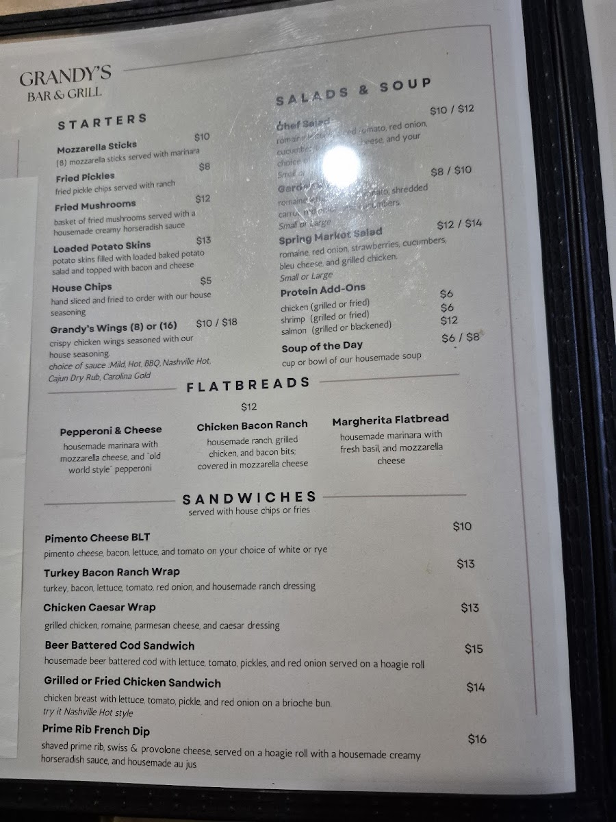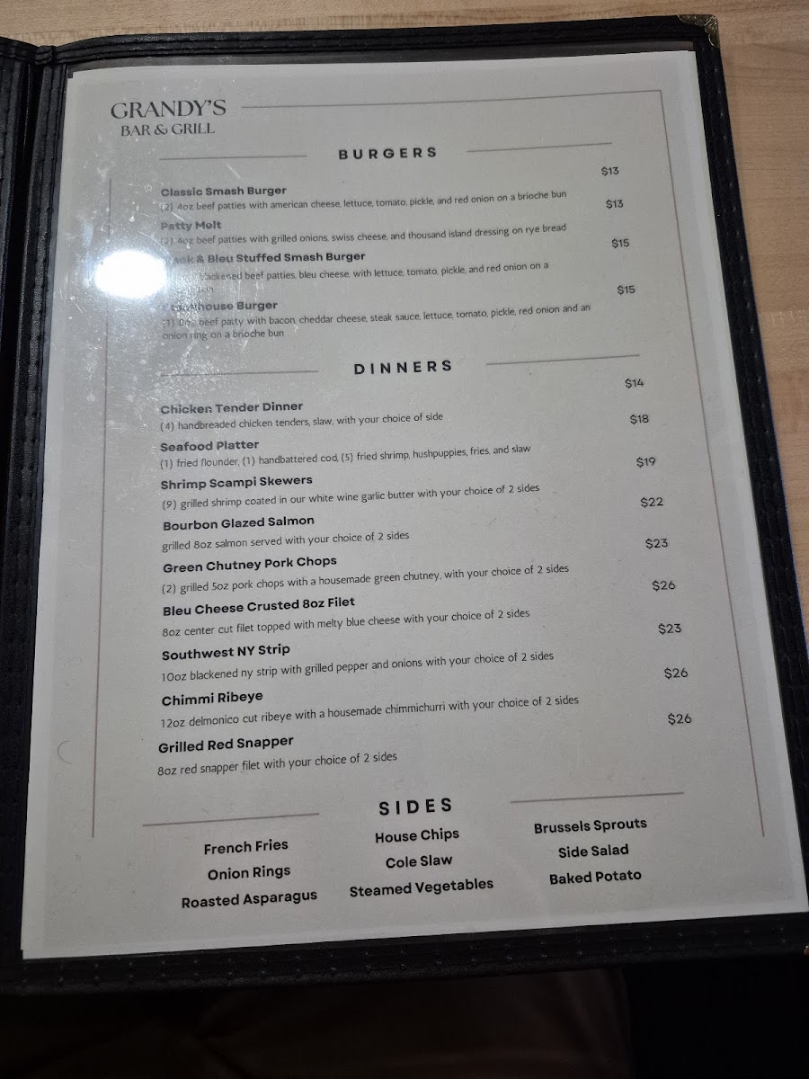 Whether stopping in for a hearty lunch, a relaxed dinner with friends, or drinks and shareable plates, Grandy’s Bar and Grill provides a menu suited for everyday dining, casual celebrations, and group meals alike.