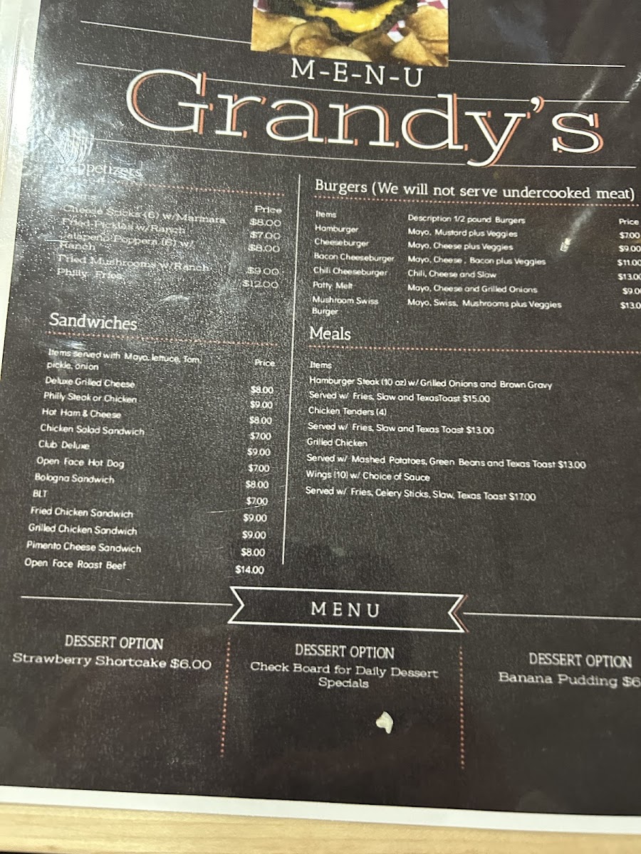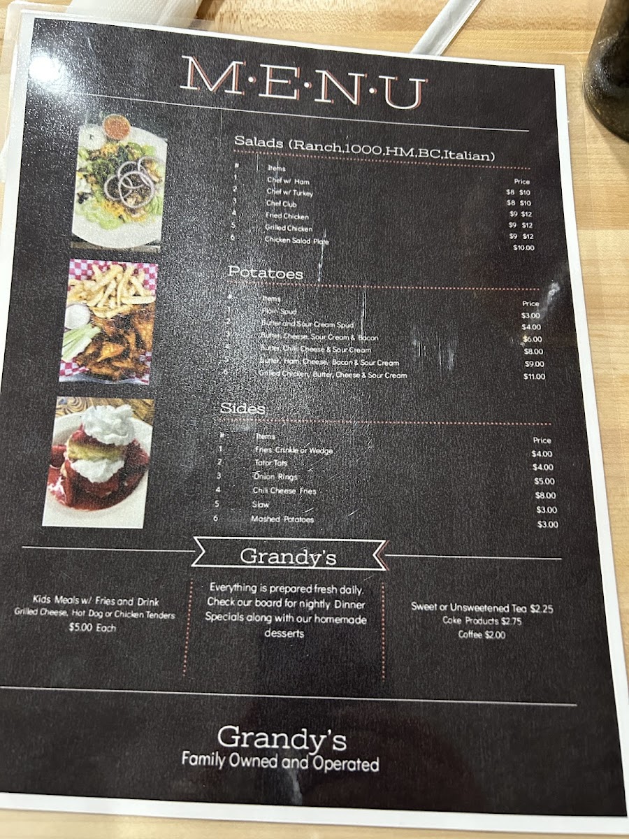 Grandy’s Bar and Grill on Deer Creek Drive in Crossville offers a welcoming, laid-back dining experience built around hearty American favorites, fresh ingredients, and a well-stocked bar. The menu balances classic comfort food with crowd-pleasing grill specialties, featuring juicy burgers, sizzling steaks, crisp salads, and satisfying sandwiches alongside refreshing beers, cocktails, and non-alcoholic beverages. Portions are generous and prices are approachable, typically ranging from affordable casual meals to moderately priced entrées, providing strong value for both quality and quantity.